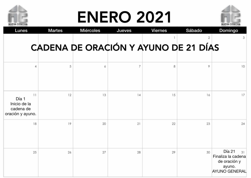 Cada texto bíblico será una guía para realizar los clamores, para cada día escogido en estos 21 días de oración y ayuno correspondiente. La cadena inicia el Lunes 11 de Enero, y concluirá como un ayuno general de toda la iglesia, el Domingo 31 de Enero del año 2021.