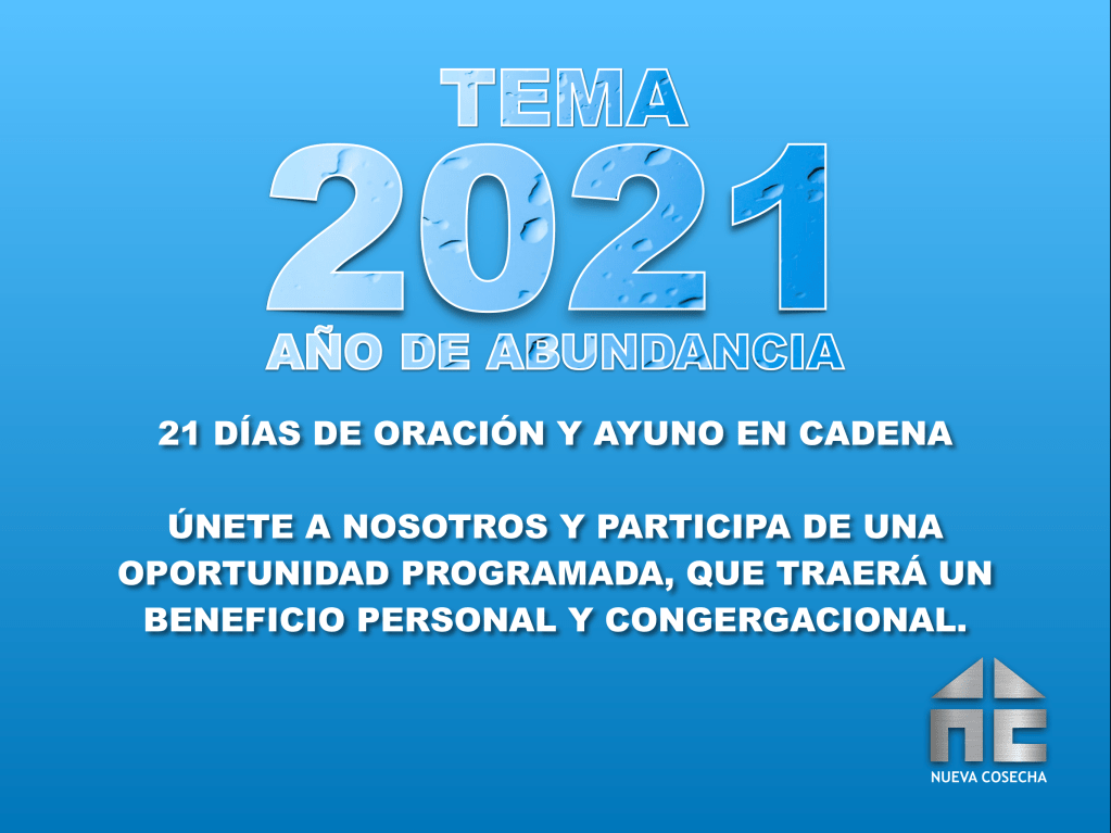 El tema para este año 2021, se titula: EL AÑO DE ABUNDANCIA. Cada nuevo año, es un desafío y una nueva oportunidad para un propósito individual de recibir de la abundancia del Señor. Para el nuevo año 2021, hay que proponerse como meta, buscar el acercamiento al Señor, porque Él dará crecimiento y abundancia espiritual. Dios te ha preservado para este nuevo año, habiendo pasado con vida la pandemia que le quitó la vida a millares de personas en el mundo. Y este año tendrá un significado muy especial en cuanto a las provisiones de Dios. Si Dios te quiere de pie, afírmate y espera confiadamente en sus promesas.