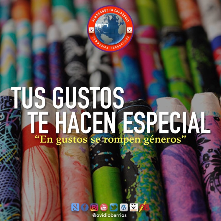 El asunto de las diferencias, está en reconocer que dones y talentos tienen cada uno. Es de verificar que clase de vaso somos, y el uso que Dios marcó en cada uno de nosotros. Reconozcamos que somos distintos a los demás; y únicos a la vez, porque Dios así designó que fuera cada una de sus criaturas. No nos avergoncemos de algunas cosas que son parte intrínseca de nuestra vida; con excepción de aquello que esté fuera de lugar, y que nos cause conflictos con los demás. Escoge el género que sabes que te gusta, y por el cual fuiste llamado a escoger para vivir. Y recuerda: Tus gustos te hacen especial.