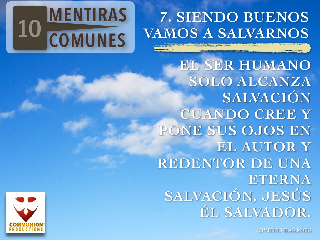 Es una mentira que el hombre se pueda salvar por su propia cuenta. Para comenzar, está muerto en delitos y pecados, y no puede resucitar por sí mismo. Esta hundido en el pozo de la maldad, y no puede salir por sus propias fuerzas. Esta atado y encadenado como esclavo, y no puede conseguir su libertad de ninguna manera. Aparte de esto es ciego, leproso, débil, y no conoce la verdad; por lo consiguiente, está perdido y sin esperanzas de salvación. El ser humano solo alcanza salvación cuando cree y pone sus ojos en el Autor y Redentor de una eterna salvación, Jesús ÉL SALVADOR.