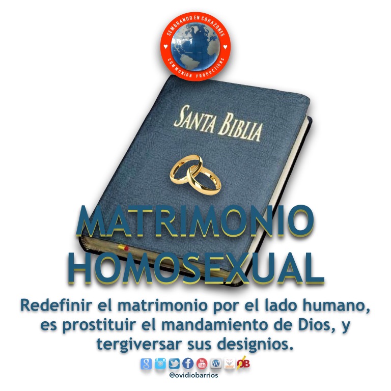 La Biblia enseña que la homosexualidad y la idea del matrimonio entre personas del mismo sexo, es un pecado contra Dios y no fomentan los valores bíblicos. La Biblia, la historia, la fisiología y la creación en sí misma, argumentan en contra del matrimonio homosexual. El matrimonio está diseñado para ser entre un hombre y una mujer. El matrimonio del mismo sexo va en contra del orden natural y del propósito de Dios.