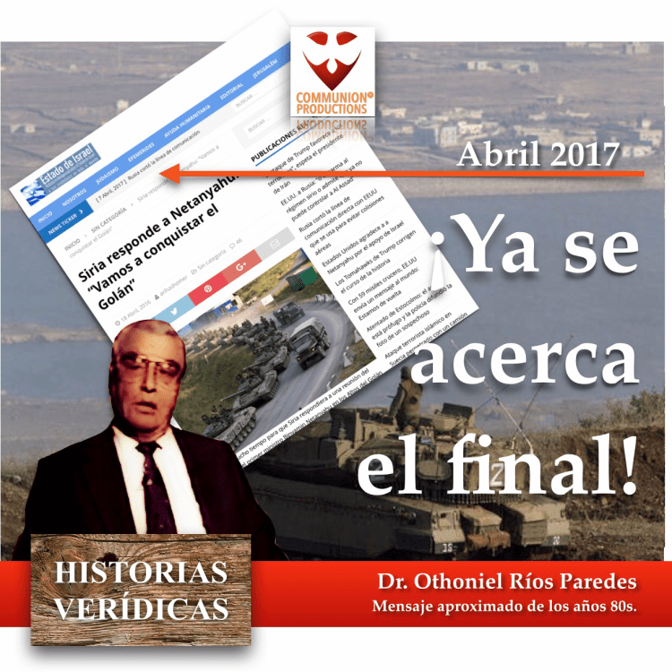 Cuando usted oiga en las noticias que las alturas del Golán fueron entregadas a Siria, y que se están armando los Musulmanes por ese lado, sepa que: «el fin llega«. No le estoy diciendo fechas, solo estoy diciendo que cuando fueren entregadas, Israel empezará a declinar, y la paz del mundo es el Israel próspero de ahora. Cuando decline, y decline, y decline; van a abusar de Israel, y van á invadirla todos. Y… «este es el fin«.