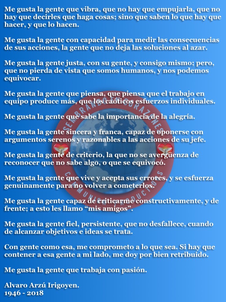 Parte de un mensaje grabado en las redes sociales, donde él estuvo muy activo, me llamó la atención, y lo copié literalmente. Creo que parte de sus pensamientos, revelan un poco la clase de persona que era don Alvaro Arzú. Estos pensamientos que le pertenecen a Alvaro Arzú, no los pongo por política, ni por seguidor personal, ni por polémica. Sencillamente, percibo a una persona, que como ser humano; tenía sus maneras de trabajar y acercarse a la gente, y usó las oportunidades que le tocó en esta vida para lograrlo. Querido lector, respeto su criterio de él como persona, y de lo que piensa de su carrera política, yo solo les transmito aquí lo que él dejó en uno de esos mensajes que transmitió: