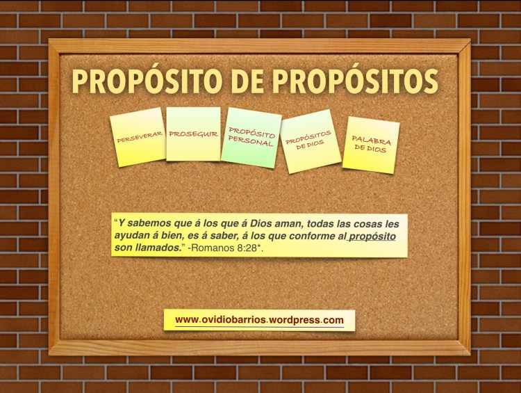 El propósito de Dios no puede fallar, porque asegura cada proceso con el fin de que cada una de las personas puedan alcanzar sus propósitos. El apóstol Pablo dijo: “No que ya haya alcanzado, ni que ya sea perfecto; sino que prosigo, por ver si alcanzo aquello para lo cual fuí también alcanzado de Cristo Jesús. Hermanos, yo mismo no hago cuenta de haberlo ya alcanzado; pero una cosa hago, olvidando ciertamente lo que queda atrás, y extendiéndome á lo que está delante, prosigo al blanco, al premio de la soberana vocación de Dios en Cristo Jesús. Así que, todos los que somos perfectos, esto mismo sintamos; y si otra cosa sentís, esto también os revelará Dios. Empero en aquello á que hemos llegado, vamos por la misma regla, sintamos una misma cosa.” -Filipenses 3:12-16. — El fin de la vida para todo ser humano está en la muerte. Sin embargo, para el creyente en la fe de Jesús, el fin de la existencia terrenal está en morir; y el comienzo de la nueva vida está en la resurrección de entre los muertos. En lo espiritual es similar, el creyente estaba muerto y Jesús le dio vida en una resurrección de fe. Por lo tanto, el propósito de vida ya fue establecido en la muerte de Jesús; y con Él, todos los beneficios de la nueva vida en su resurrección. Yo también estuve muerto; pero, ahora vivo por Jesús; porque Él vive, yo también vivo, y por Él viviré eternamente con Él. El propósito de Dios es perfecto en su meta de galardones. El propósito humano debe ser alcanzar la meta del propósito divino. Los procesos externos del mundo generan procesos internos en cada creyente. Los procesos en acción en la vida de cada creyente; delatan y desarrollan decisión, enfoque, fuerza, determinación, perseverancia, y la esperanza de sus propósitos.