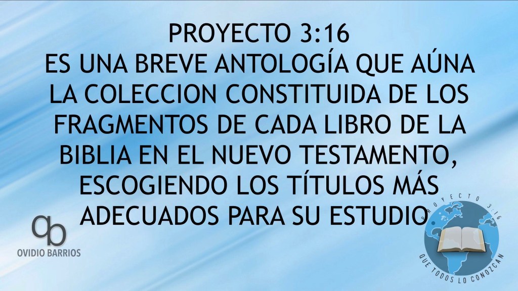En la serie: Proyecto 3:16, no hay nada nuevo, ni asombroso; sino una simple curiosidad y perspicacia de este su servidor. No se trata de interpretar estos números; sino de usarlos como un punto de referencia al aprendizaje y memorización de algunas verdades de la Biblia. Proyecto 3:16, es la serie de algunos títulos en los temas bíblicos, tales como: El amor, la redención, la gracia, la piedad, y la salvación, etc.; por medio de nuestro Señor Jesucristo. El contenido de cada verso, será lo que más importe en la memorización de los 3:16, en los libros del Nuevo Testamento.