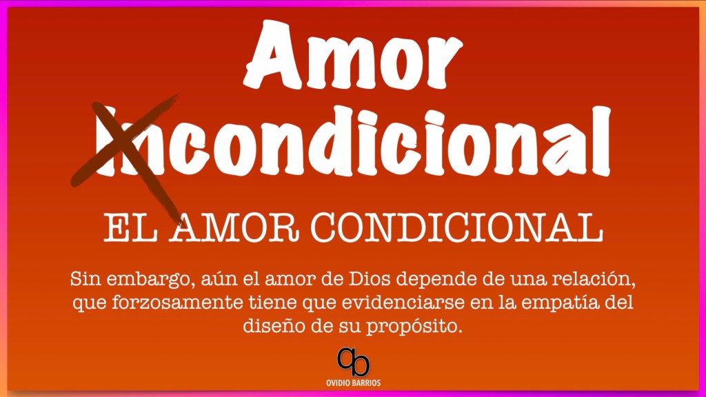 Aquí es donde tengo que referir el amor condicional de Dios, basado en el amor humano hacia Él. No hay nada reprochable en el amor divino. No hay falla ni carencia en el amor de Dios, porque es perfecto y con propósito. Sin embargo, aún el amor de Dios depende de una relación, que forzosamente tiene que evidenciarse en la empatía del diseño de su propósito. Recordemos que Dios ya dio la evidencia de su gran amor incondicional para la humanidad, al dar á Jesús quien se entregó y sirvió por amor (Juan 3:16). Dado que Dios no es un Padre alcahuete, ha dejado determinado que quienes le creen, le obedecen y le aman, también serán amados de manera directa. El hombre no puede pretender cambiar el curso de las cosas que Dios ha diseñado de forma perfecta, porque el amor humano es limitado.